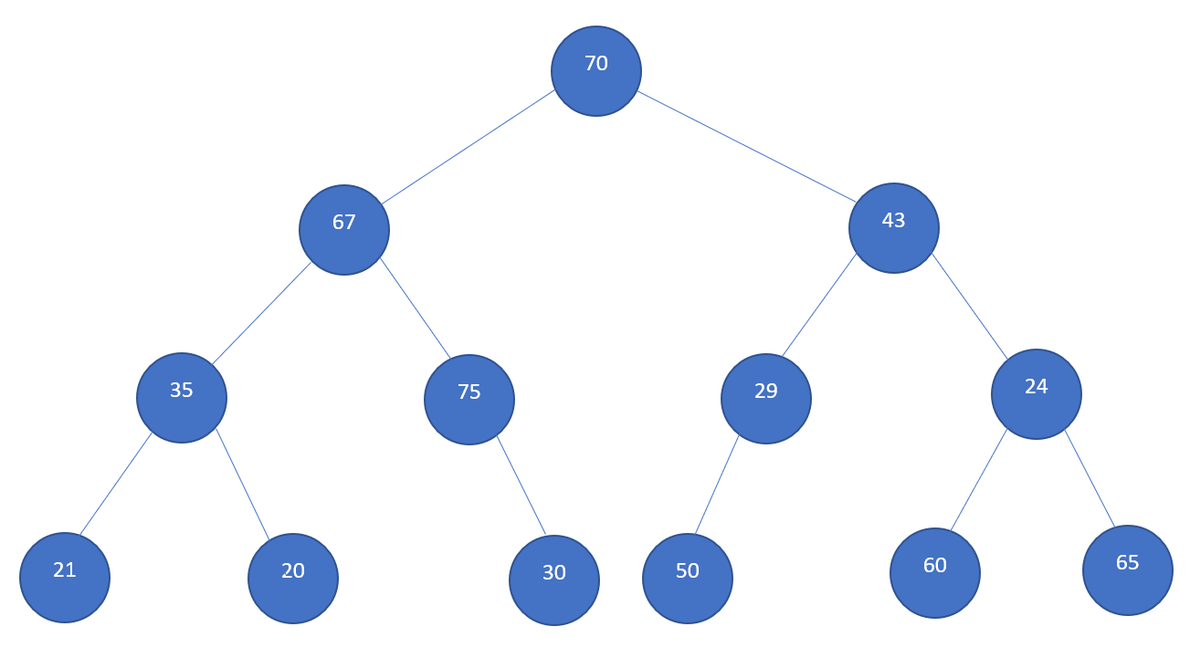 The preorder traversal for above binary tree will be [70, 67, 35, 21, 20, 75, 30, 43, 29, 50, 24, 60, 65]