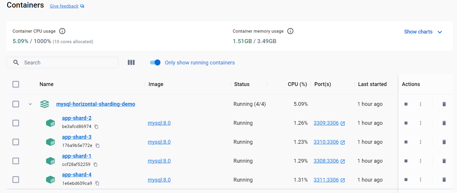 4 MySQL shards running as docker containers