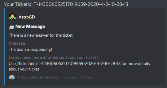Getting in touch with the team on a server with many members can be very difficult and frustrating. Your question or the teams answer might get lost in the chat and you need to scroll and search if you want to re-read the messages. Thats why the ticketsystem is for you! If you have questions you can start a ticket and the team will be notified about your issue. But there's more: You'll even get a DM from the bot if your case updates so that you also won't miss an update ever again.