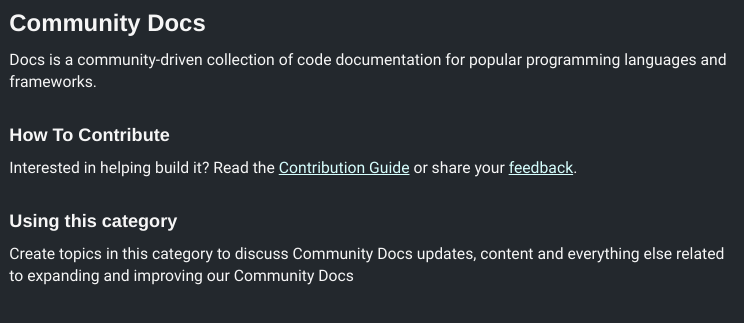 I see why you linked to the "Codecademy" (meta convos) category now. I'm concerned with discussions around Docs getting lost among the general meta convos, so maybe we can create a new category in Get Help. |