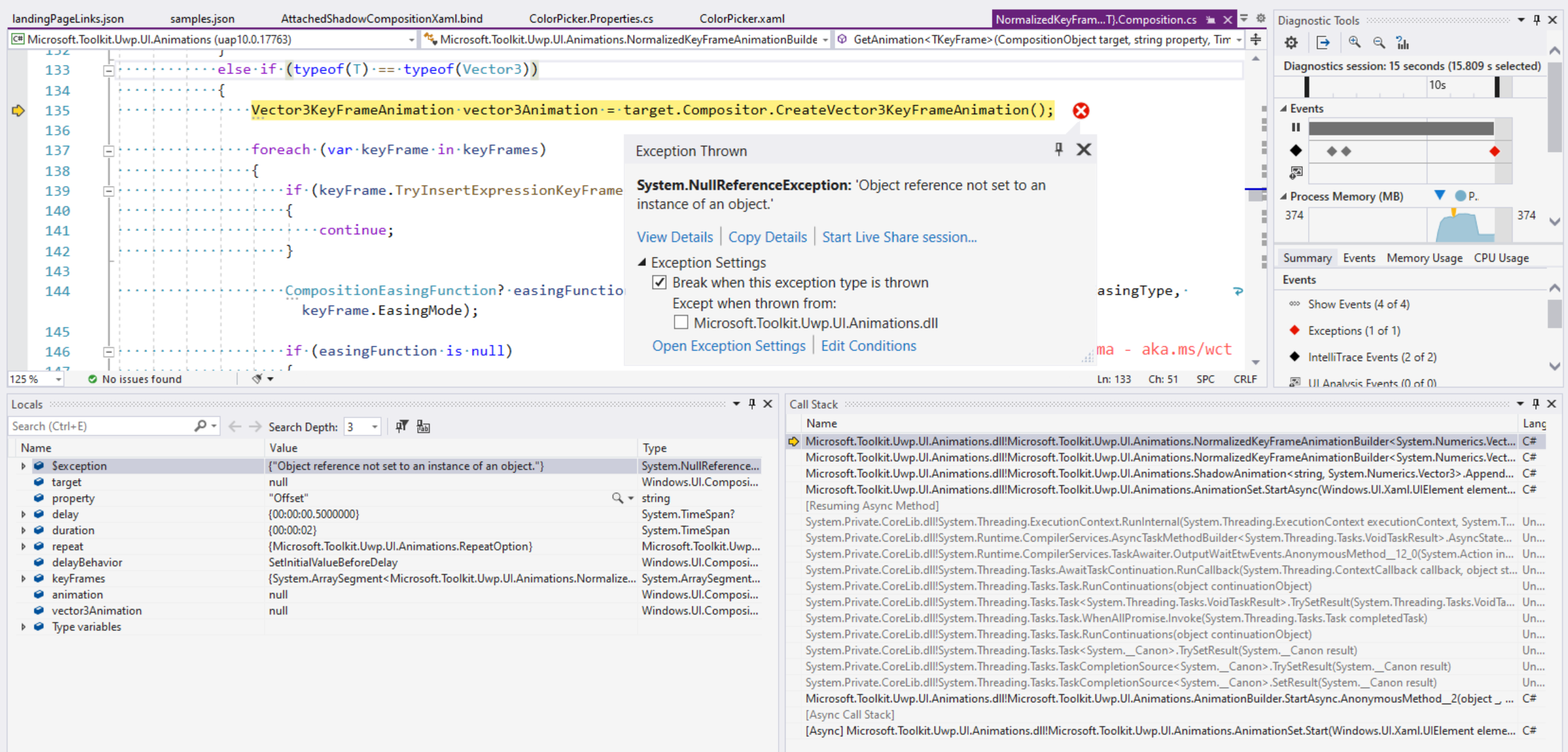 Getting a Null Reference exception when navigating away from a sample page that is animating.