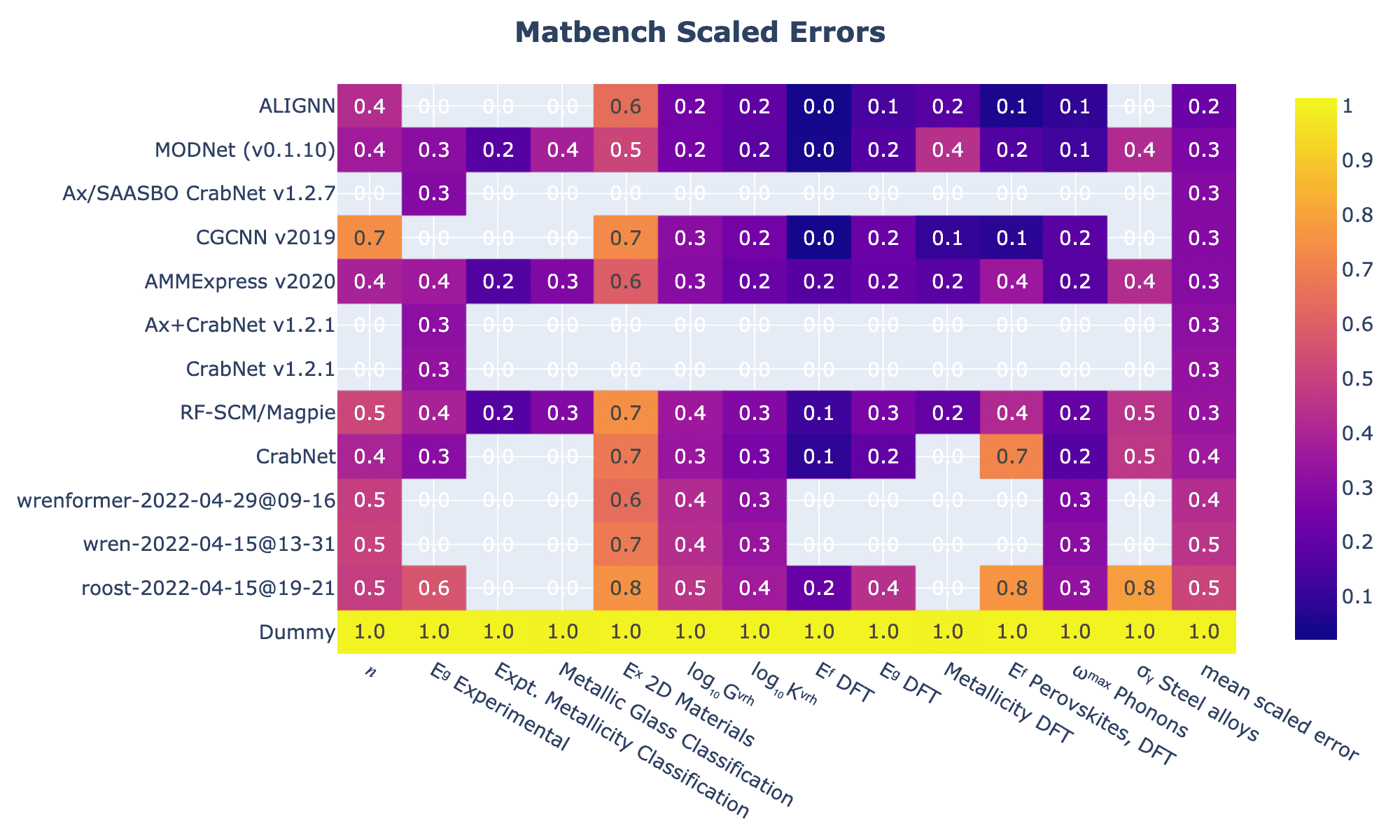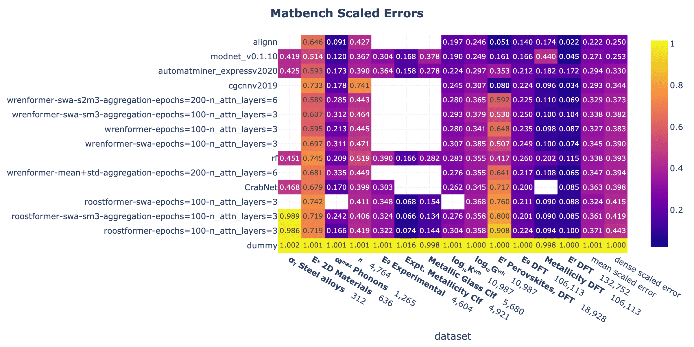 TransformerEncoder. It also prepares Matbench submissions for Roost and Wren (structure tasks only for Wren).The Wren rewrite as a transformer encoder was necessary to run robustly across Matbench tasks as the original Wren would run into out-of-memory errors during training and inference on materials with large numbers of Wyckoff positions (< 16 was a safe cutoff). This happened even on A100 GPUs with 80 GB RAM.