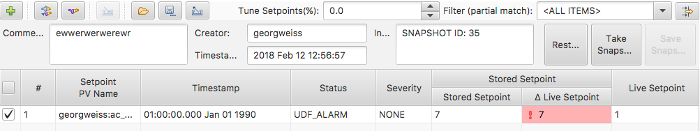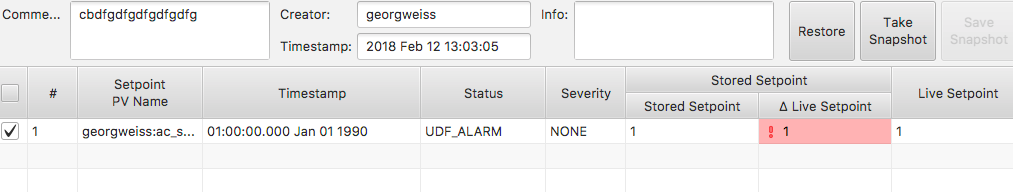 Using a simple integer value as PV value, Save & Restore in CS Studio erroneously shows a non-zero delta value even if stored set point and live set point are equal, or a wrong value. See attached screen shots:
