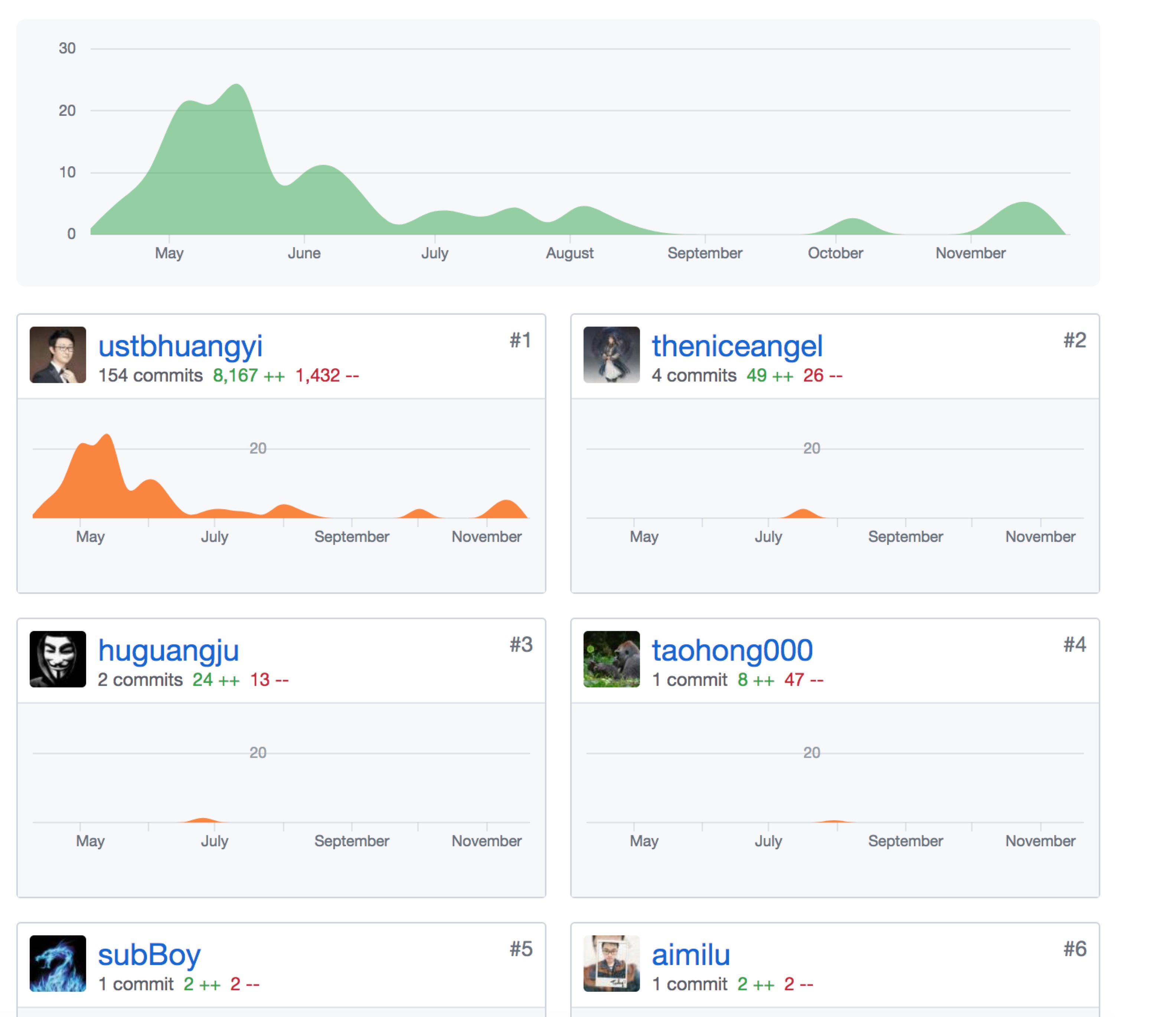 这一张是代码提交记录,可以看到除了我还是有一些很不错的同学在一起维护这个项目,这其中有一个同学学习非常主动,自驱力很强,常与我探讨技术问题,最近他也加入了滴滴,在我们部门做了很多的产出。