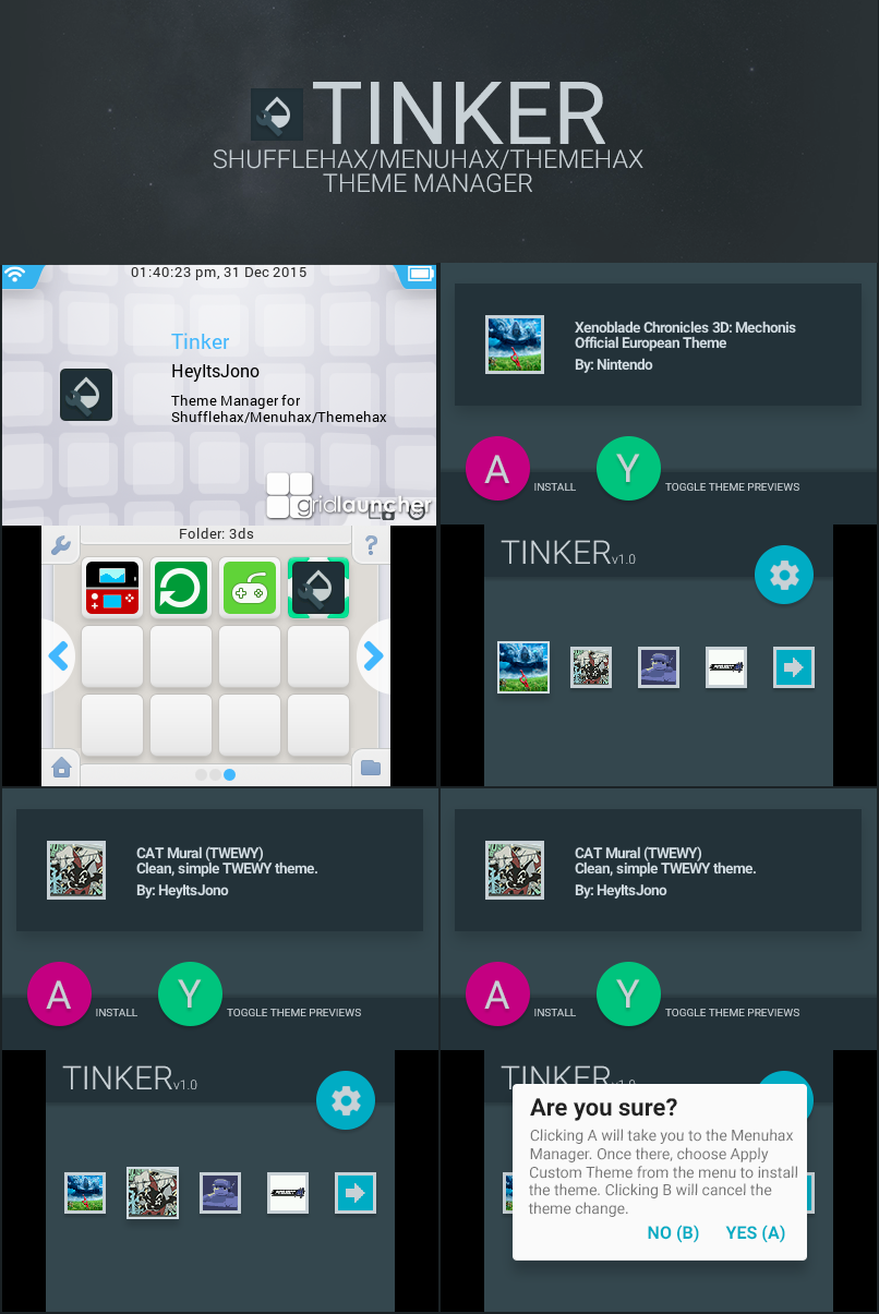 NOTE: If you have a Japanese 3DS console, there is a bug in the 3dsx file which stops Tinker from running. You'll need to download 15avaughn's patched Tinker.3dsx file and replace /3ds/Tinker/Tinker.3dsx with that patched Tinker.3dsx. Furthermore, launching 3dsx files doesn't work either, meaning after you press A to install a theme from the popup, you need to manually exit out of Tinker, enter Menuhax Manager and select Install Theme. These problems are only present on Japanese 3DS's.