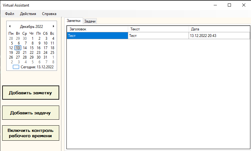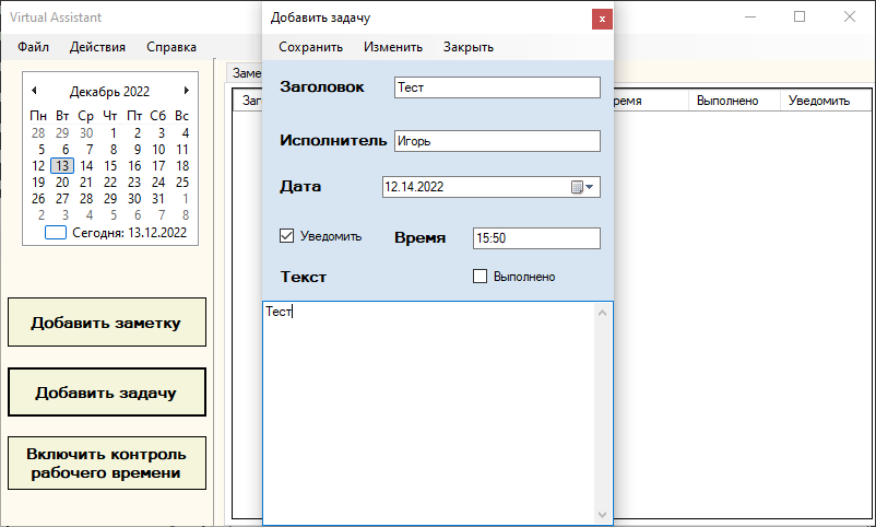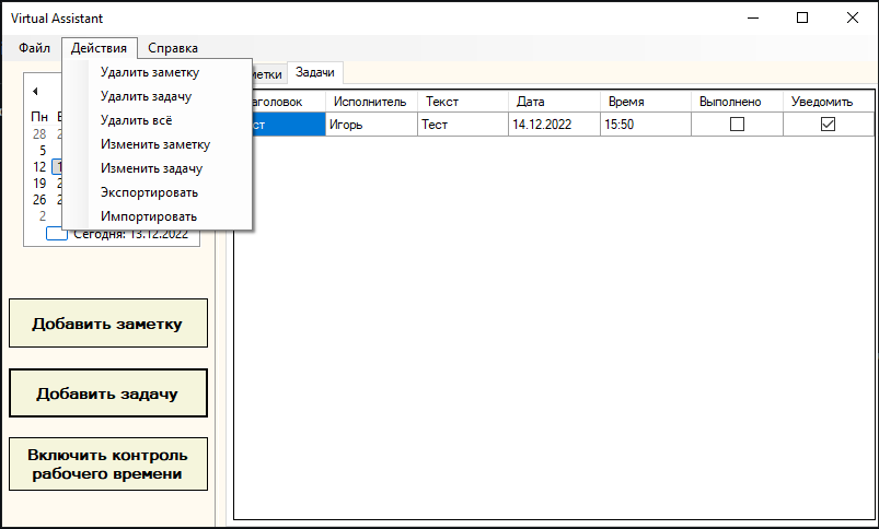 Приложение «Виртуальный помощник по организации рабочего времени». Приложение содержит следующие функции: