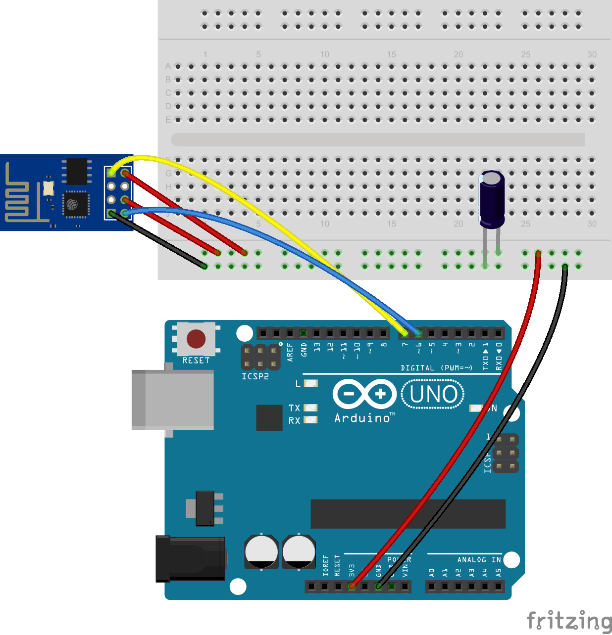 Now just wire the ESP8266 to Arduino like this below, it will allow you to start a software serial communication between the two devices. For example here, we use Arduino's Pin6