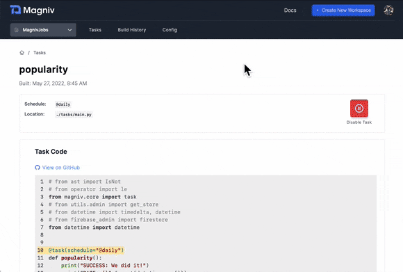 Using the Magniv dashboard makes it easy to monitor running jobs. Each Magniv task is displayed with its previous run information, logs, code snippets, and other details. Users also have the ability to disable tasks and manually trigger new runs.