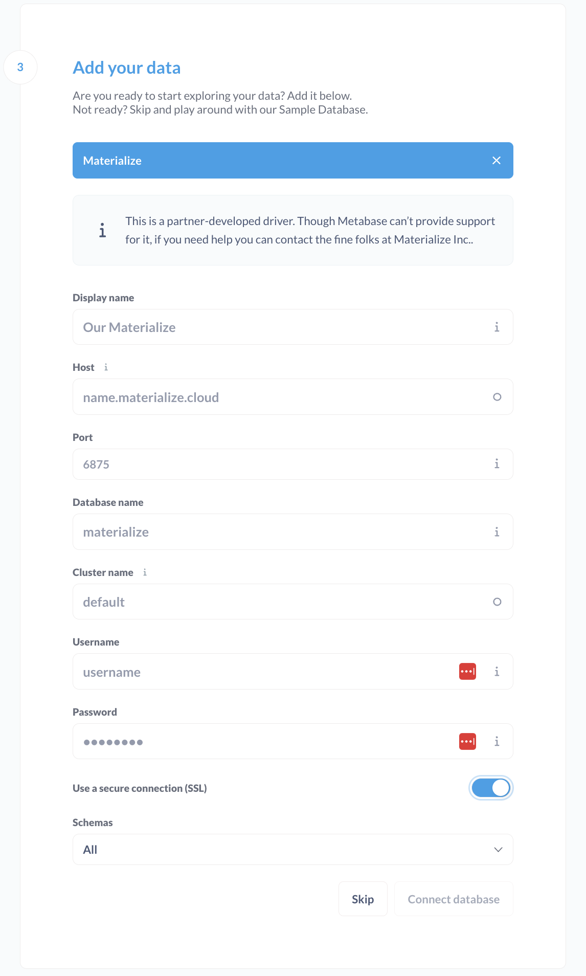 Select Materialize from the database dropdown when adding a new database. Next, use the following information to connect: