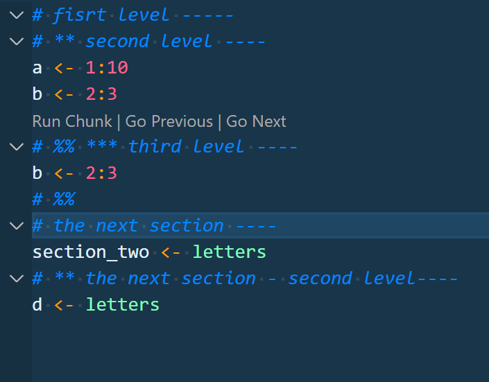 Would you like to provide an example for each of these? Also, look like the syntax might add too much complexity. I don't figure out how I can create a third level section without creating a code chunk. and for the following code chunk I expected that folding only applies to the chunk since the syntax of both code chunk # %% *** third level ----