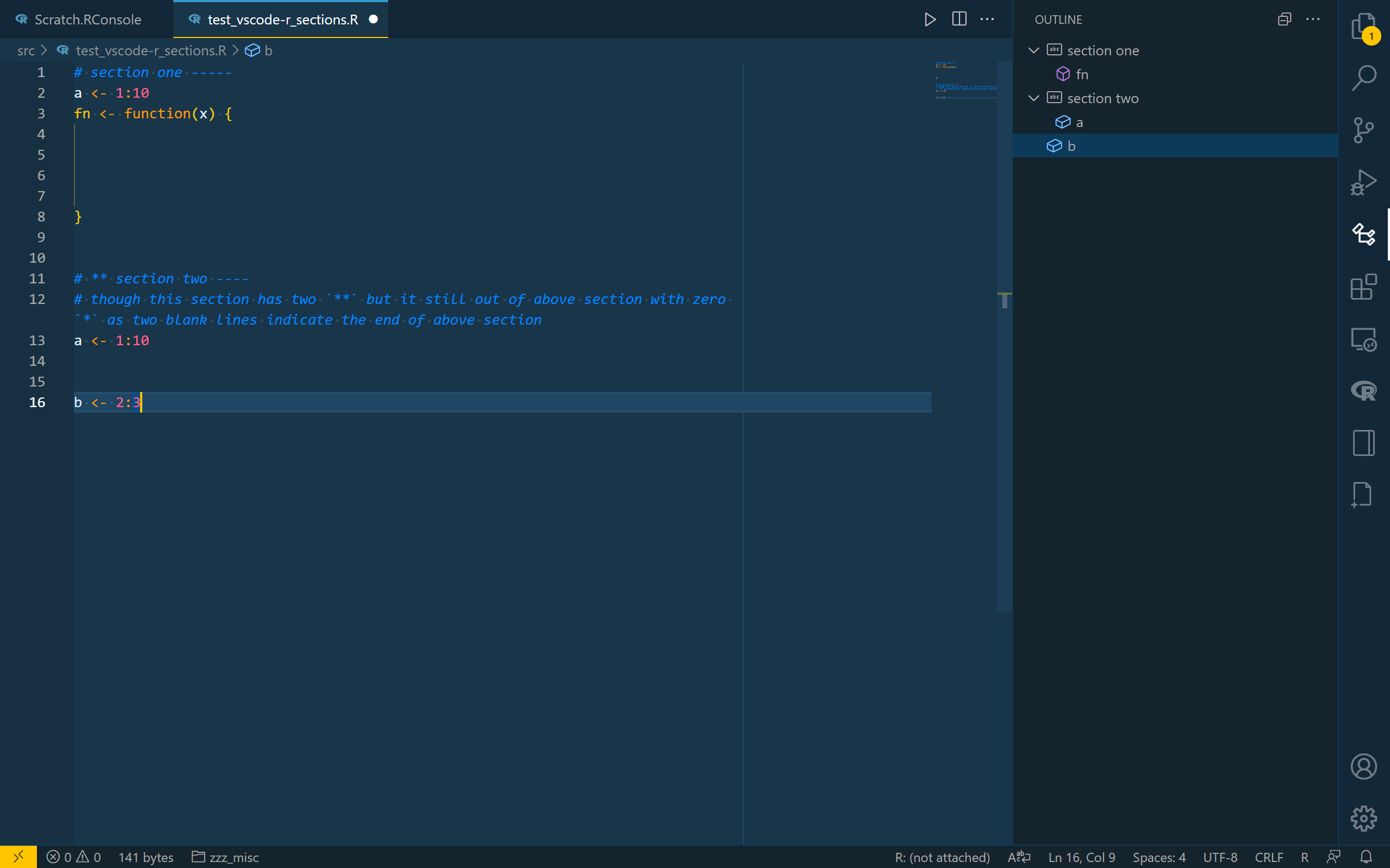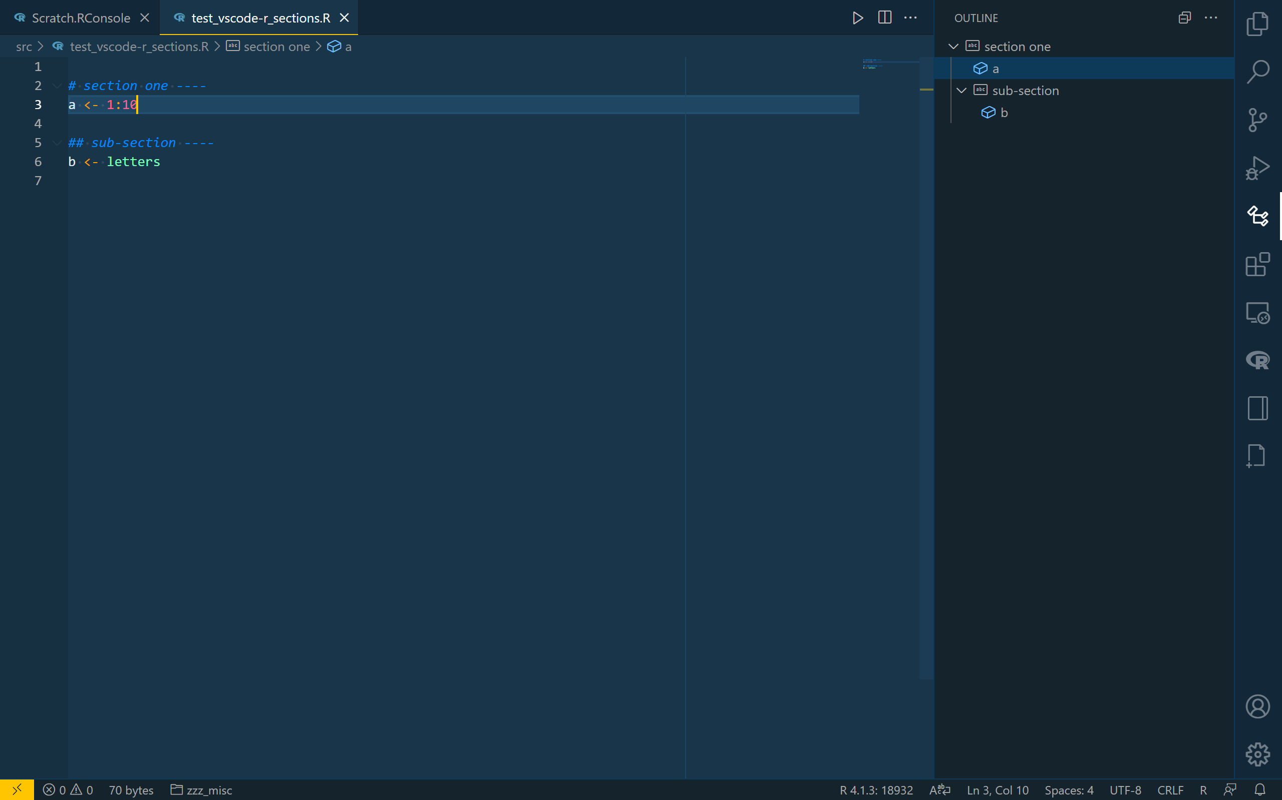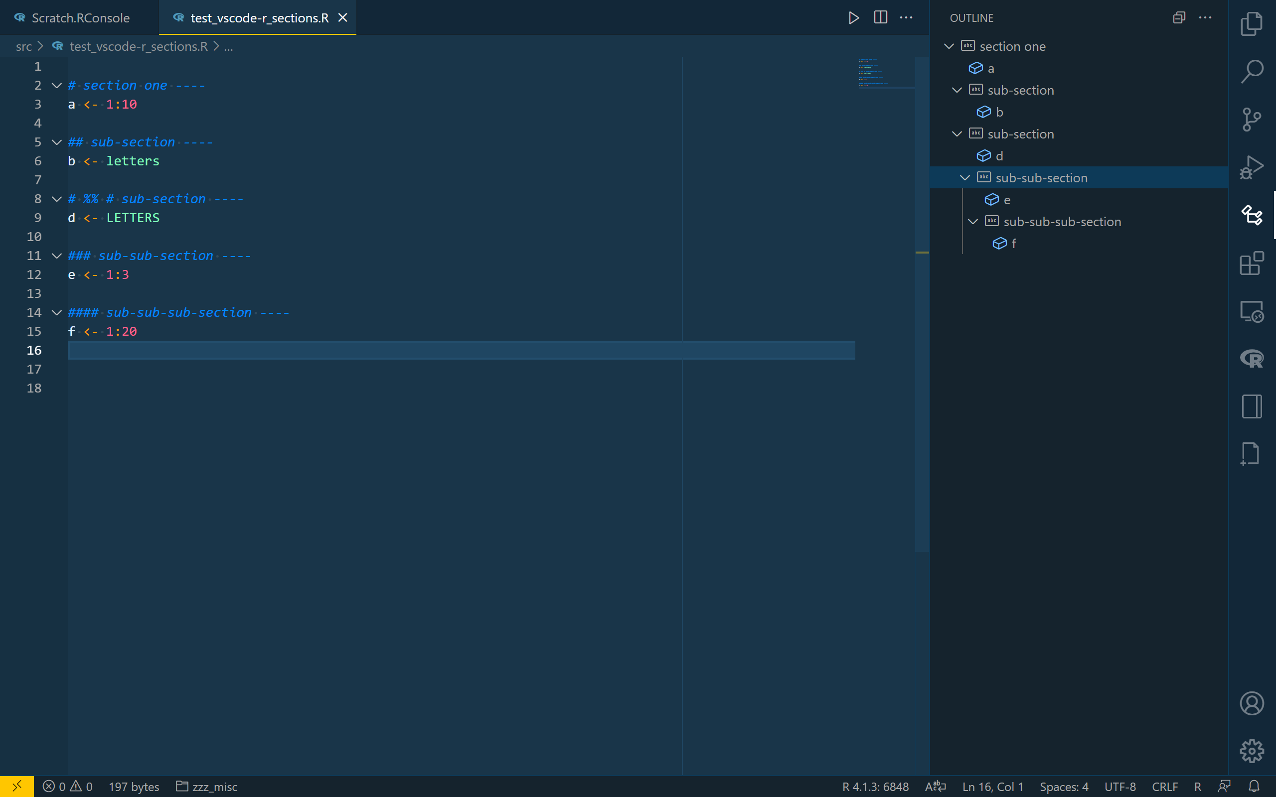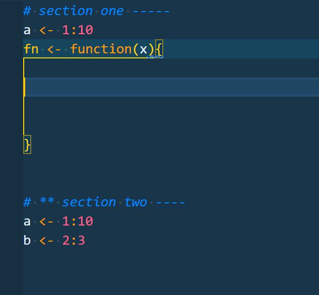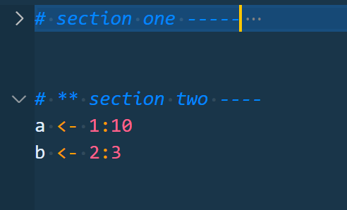 Sorry for the poor explanation, I remember RStudio can only define top-level sections before, but it can define multi-level sections now see below picture from this link. we can also define section using one of suffix I see vscode-r define fold region in If we choose to use the same way of Sorry, I cannot make my vscode screen recorder (like screen-recorder and Chronicler) work, please install via see blow example: Further, more than one blank lines out of And the current one-line range (referred here #163 (comment)) which provides just a symbol in outline is also kept by combining one of suffix |