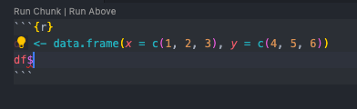 df <- data.frame(x = c(1, 2, 3), y = c(4, 5, 6))) - Start new line with