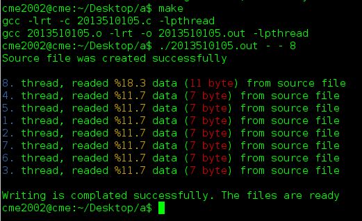 For example; let’s say that the user enters 4 threads and the size of the source file as 8 bytes. So each thread must copy 2 bytes for each. In order to be readable, your source file must be created randomly as “abcdefgh”. o 1st thread should copy from source.txt to destination.txt first 2 bytes > ab o 2nd thread should copy from source.txt to destination.txt second 2 bytes >cd