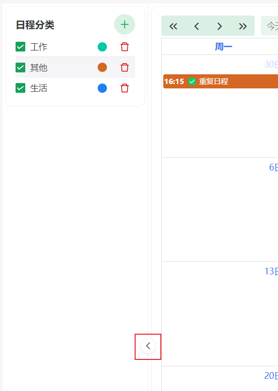 After clicking the arrow button, you can hide the schedule category view on the left, which is more friendly to small screens.