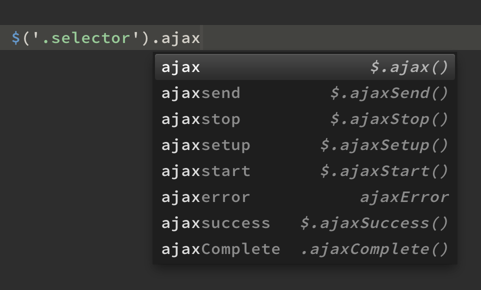 Snippets are used by typing the method name and selecting the appropriate match, see below for an example when using ajax as the tabtrigger: