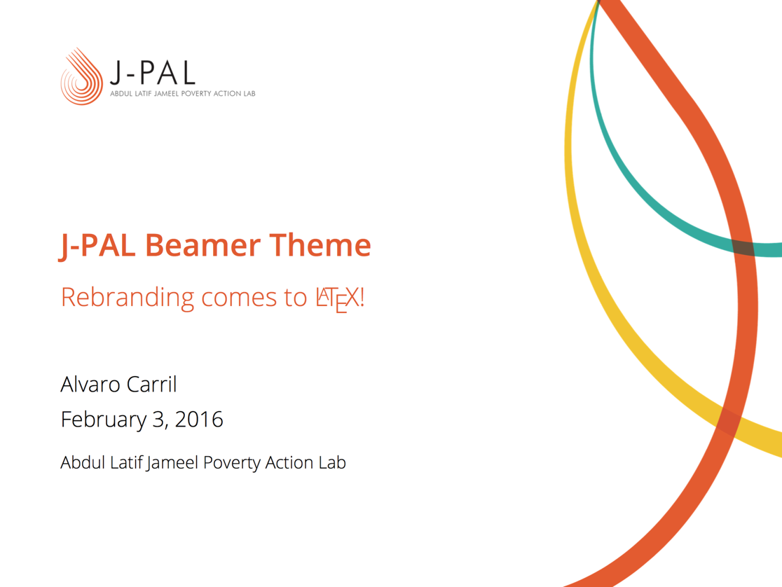 jpaltheme is a LaTeX program for making Beamer presentations that comply with J-PAL's new branding guidelines. It is designed to be easily implemented and tweaked, while mantaining all the advantages of using LaTeX. Check out a screenshot of the title slide: