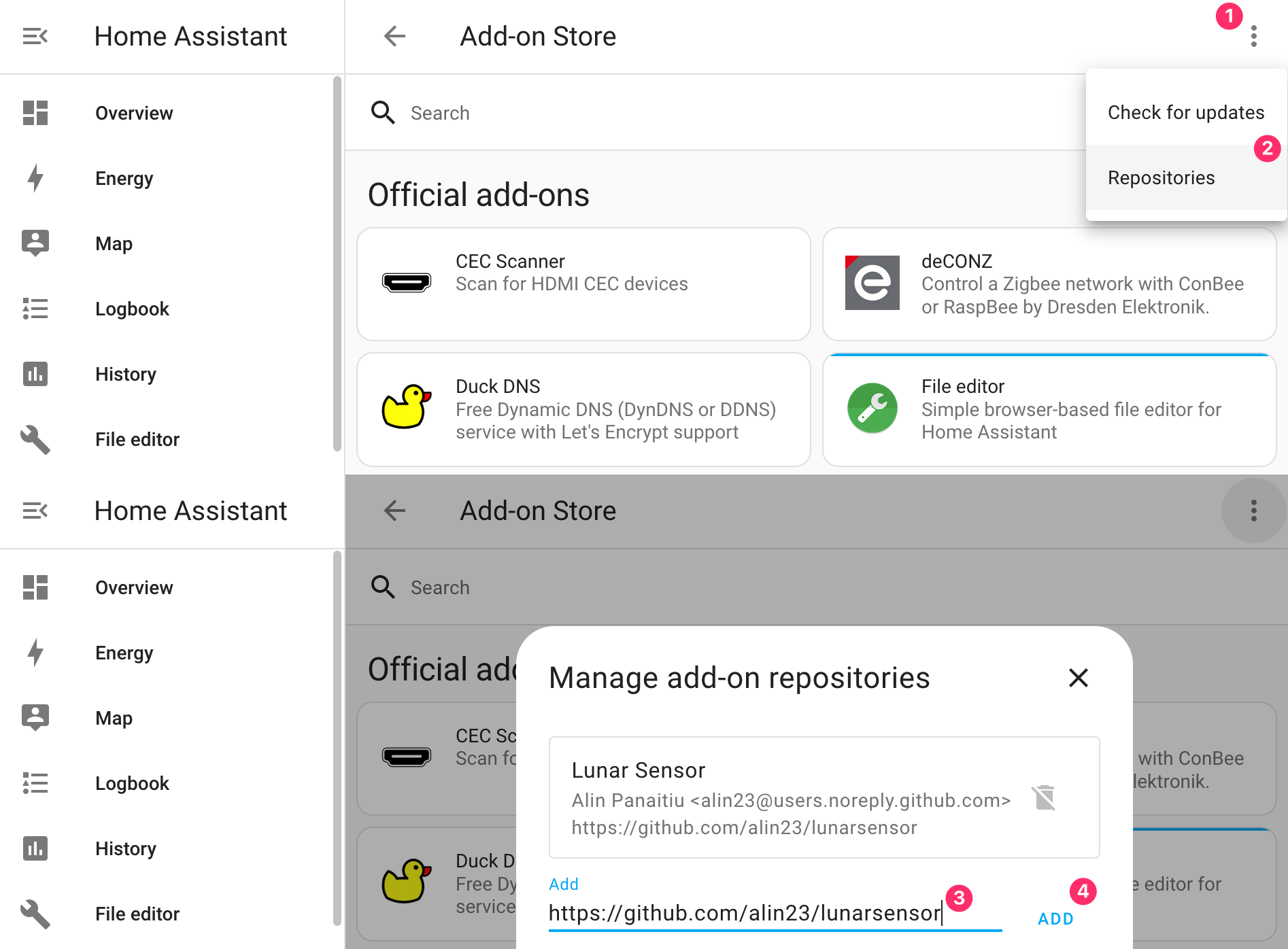 For example, if you would like to have Lunar listen for sensor events at homeassistant.local:8123/lunar/events you would run the following commands: