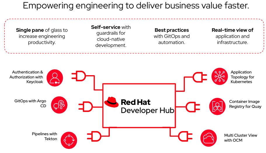 Red Hat Developer Hub is an enterprise developer portal for deploying on Openshift, for building, integrating and testing container images, for integrating GitOps, Tekton Pipelines, Registry and Authentication.