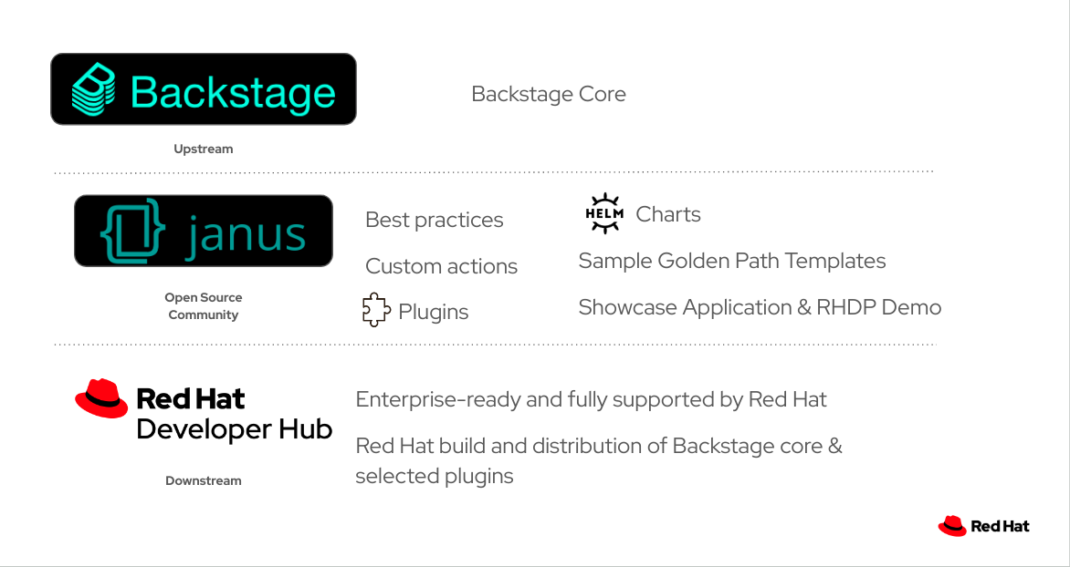 Project Janus is a community to share Backstage plugins that can be installed on Openshift and that are mainly targeted to be used with Red Hat products.