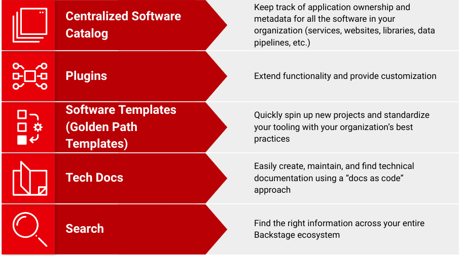 Backstage provides the core features for building developer portals, and supports plugins for extend its capabilities (platform, runtime and external APIs). Usually, Platform Teams start with Backstage and customize it using their own developed plugins.