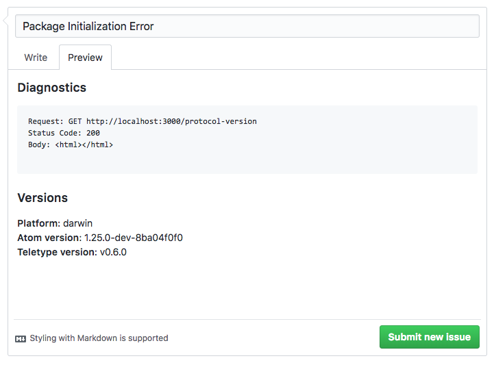 To aid in diagnosing and debugging package initialization errors (#266), this pull request incorporates the changes from atom/teletype-client#50 to provide a pre-filled GitHub Issue body with useful diagnostic information.