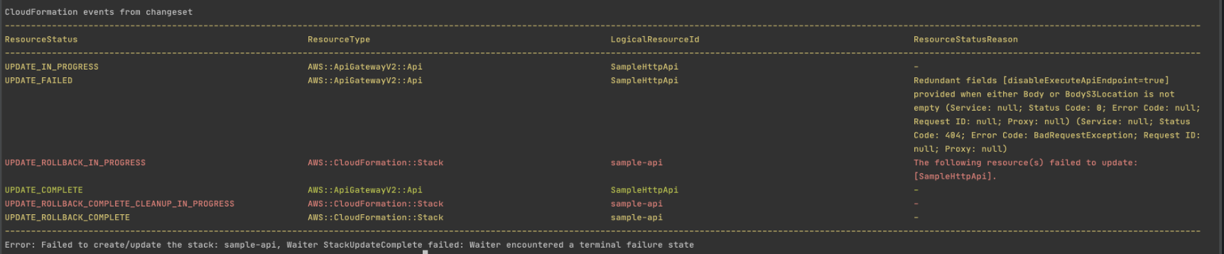 to True for disabling default endpoint on AWS::Serverless::HttpApi, stack fails with an error.