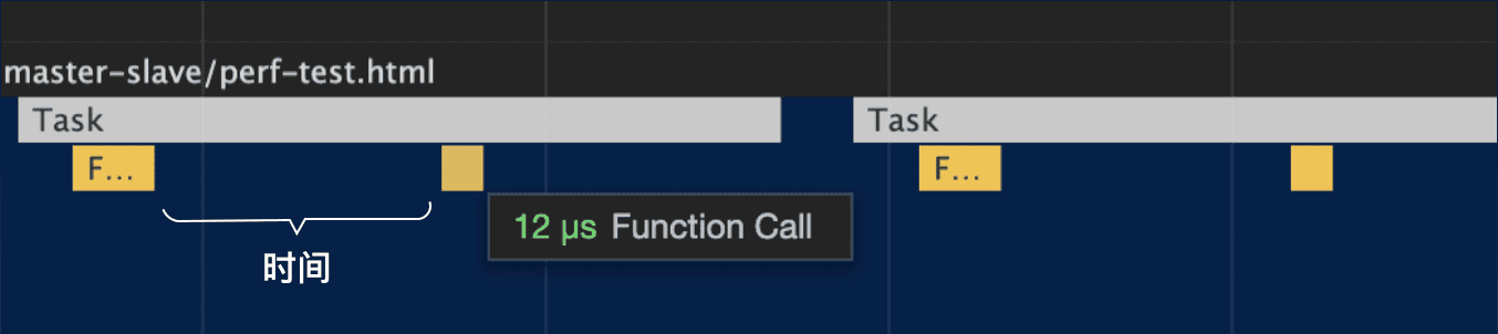 黄色的JavaScript执行方块是指令的执行,而两个指令之间有很多空闲的时间,因为执行信号的传递需要时间。所以背后的执行过程是,接受一个指令绘制一下,然后等一会又接收一个新的指令然后再绘制下,当指令数量庞大的时候,性能问题非常明显,绘制一整个UI界面非常慢。