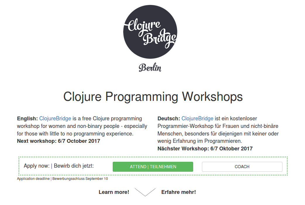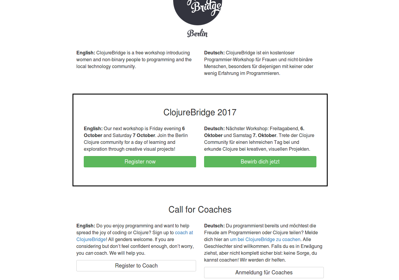 Thanks @pepper-aenn & @vsmart for translation help!! I'll update it now \o/ @Malwine I'm on that mobile view! Good reminder. I believe we have a coaches page that has loads more info: http://clojurebridge-berlin.org/coach/ I did want to put some more context near the coach signup button, because I'm thinking about how certain types of people are more likely to have higher barriers of feeling qualified to coach, and I want to reduce this barrier as much as possible. I remember that for myself personally, it took a previous coach telling me personally that it's okay that I didn't have much clojure experience for me to feel comfortable to sign up. I think it's worth affording a sentence or two to make people feel more welcomed. Also the upcoming multilingual update should make the page lighter! |