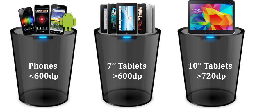 Generally speaking phones and phablets are between sw240 and sw480. 7" tablets are sw600 and 10" tablets are sw720. You can also simply add qualifiers such as layout-land to be applied for all devices in landscape mode. Here’s an illustrated example of the above procedure: