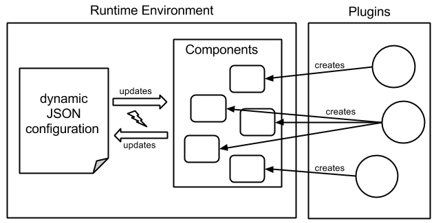 A JSON configuration structure defines the entire state of a Chiasm application. The configuration refers to plugins by name, which are invoked to instantiate instances of components. Configuration changes can be made at runtime, and Chiasm will propagate the changes through the system. The JSON configuration also updates in response to changes in the state of the component's Model at runtime.