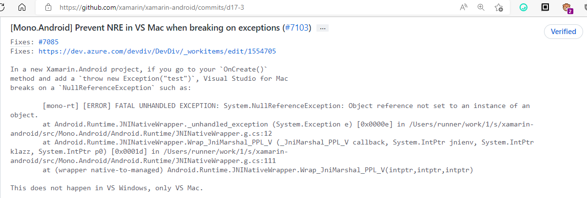 I'm getting the same error on VS for Windows v17.2.5 at Android.Runtime.JNINativeWrapper._unhandled_exception (System.Exception e) [0x0000e] in /Users/runner/work/1/s/xamarin-android/src/Mono.Android/Android.Runtime/JNINativeWrapper.g.cs:12 |