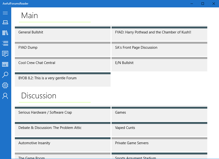 Awful Forums Reader is a Windows 10 UAP/Windows 8.1/Windows Phone 8.1 App. It allows you to access the Something Awful on a variety of different devices; Table, Phone, Desktop, and one day Xbox, IoT and Hololens (one can dream). It's really intended for tablets and phones, but it does work well on Desktops and could be extended further.
