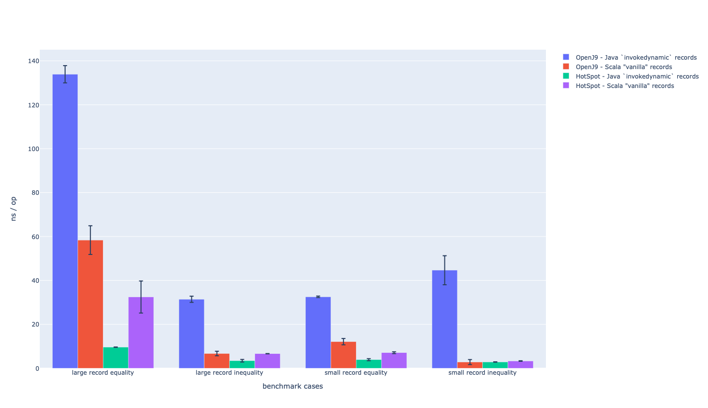Record classes introduced in JDK16 seem to be quite a bit slower on OpenJ9 than Hotspot. I put together a simple JMH benchmark to compare the performance of equals on Java records to equals on Scala case classes. Looking at the bytecode the interesting difference is: