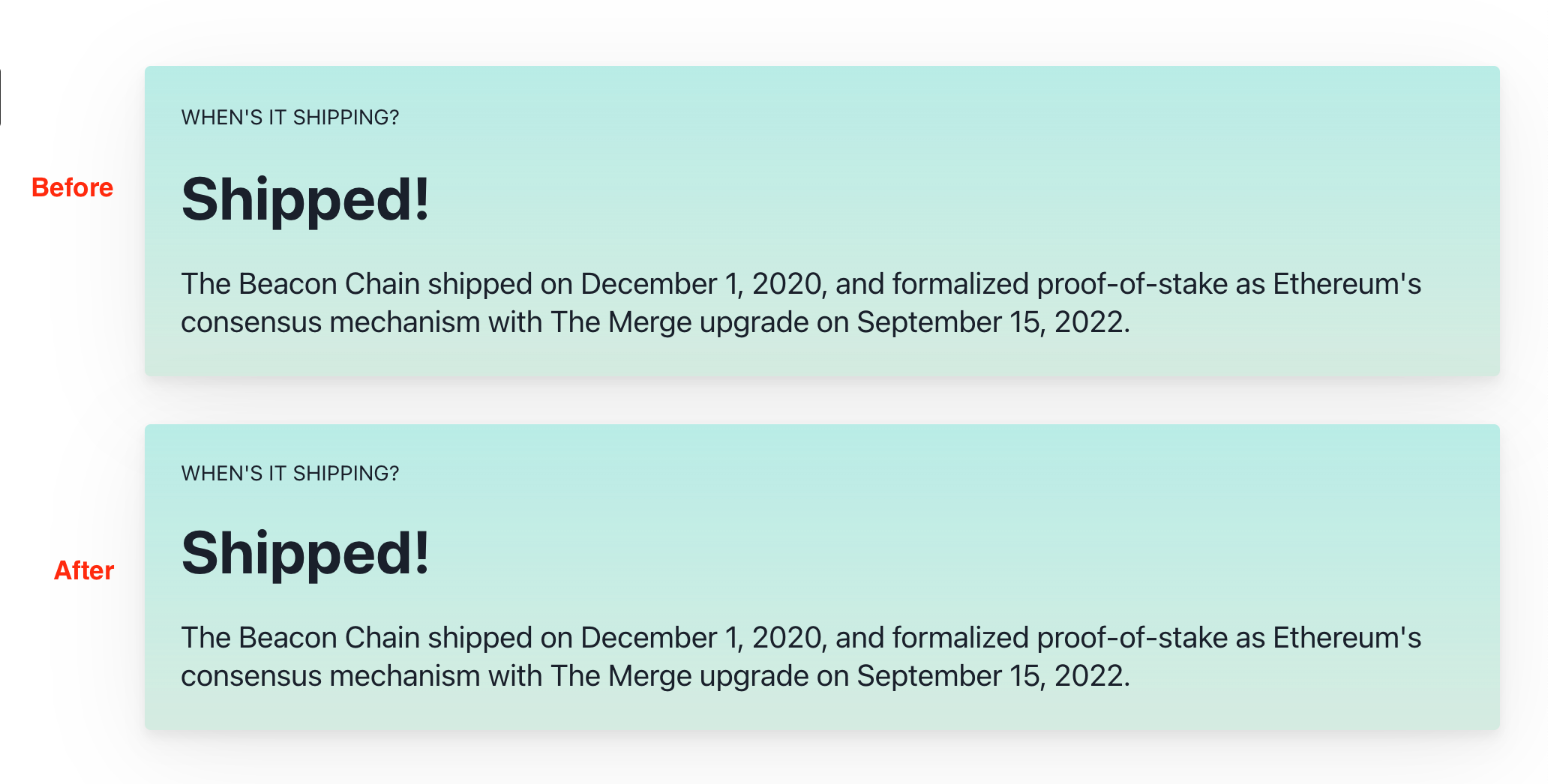 | Congrats, your important contribution to this open-source project has earned you a GitPOAP! GitPOAP: 2022 Ethereum.org Contributor: Head to gitpoap.io & connect your GitHub account to mint! Learn more about GitPOAPs here. |
