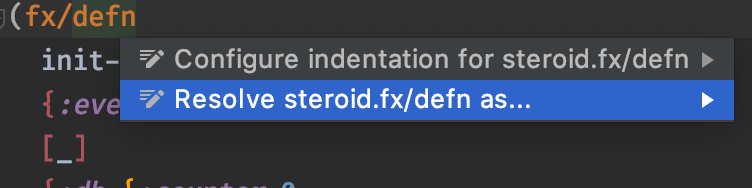 {:db (update db :counter inc)})Set cursor on fx/defn and press option+return