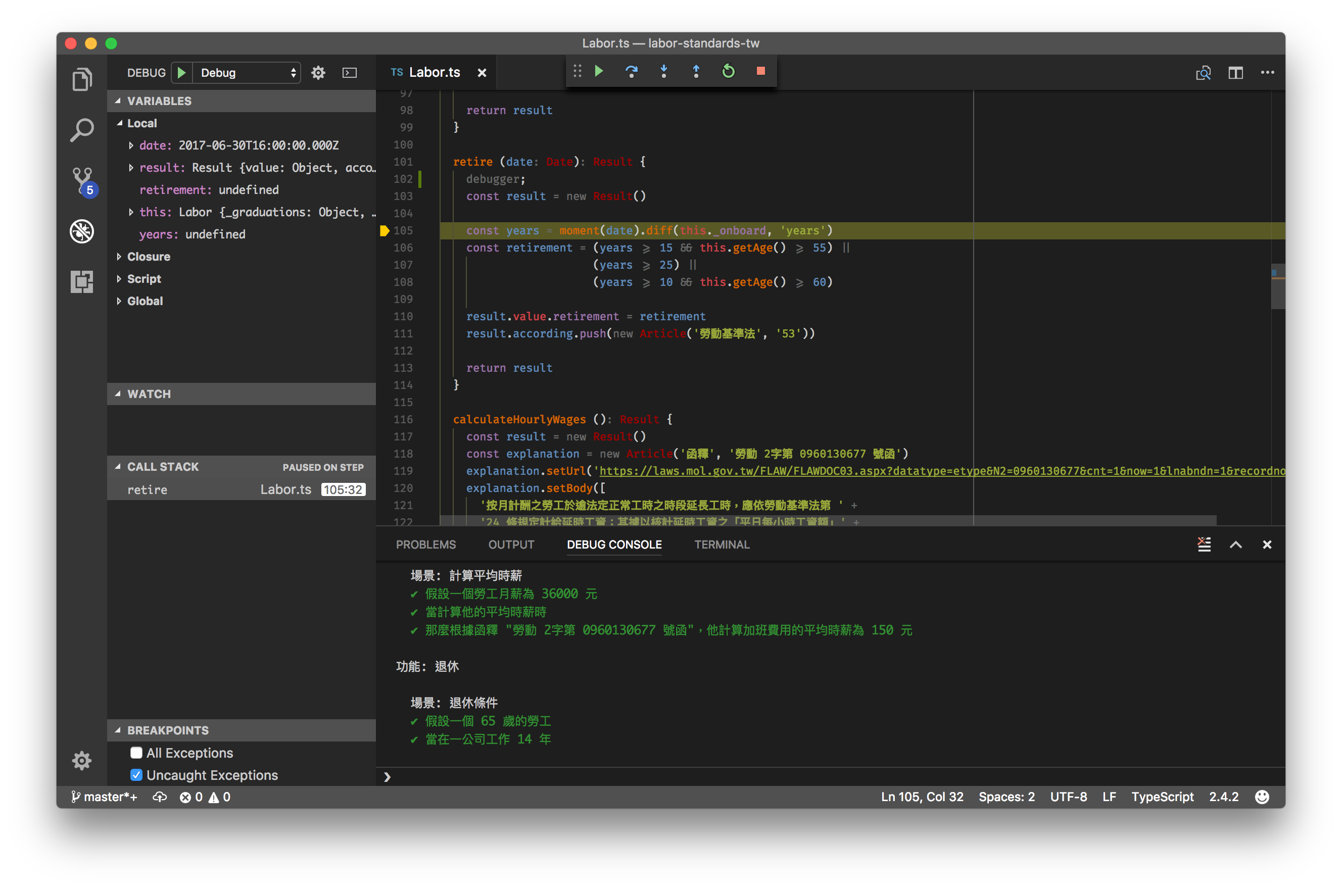 比如說你想要在 Labor.ts 底下的 retire() 下斷點,就把 debugger 加在第一行如下面程式片段:
