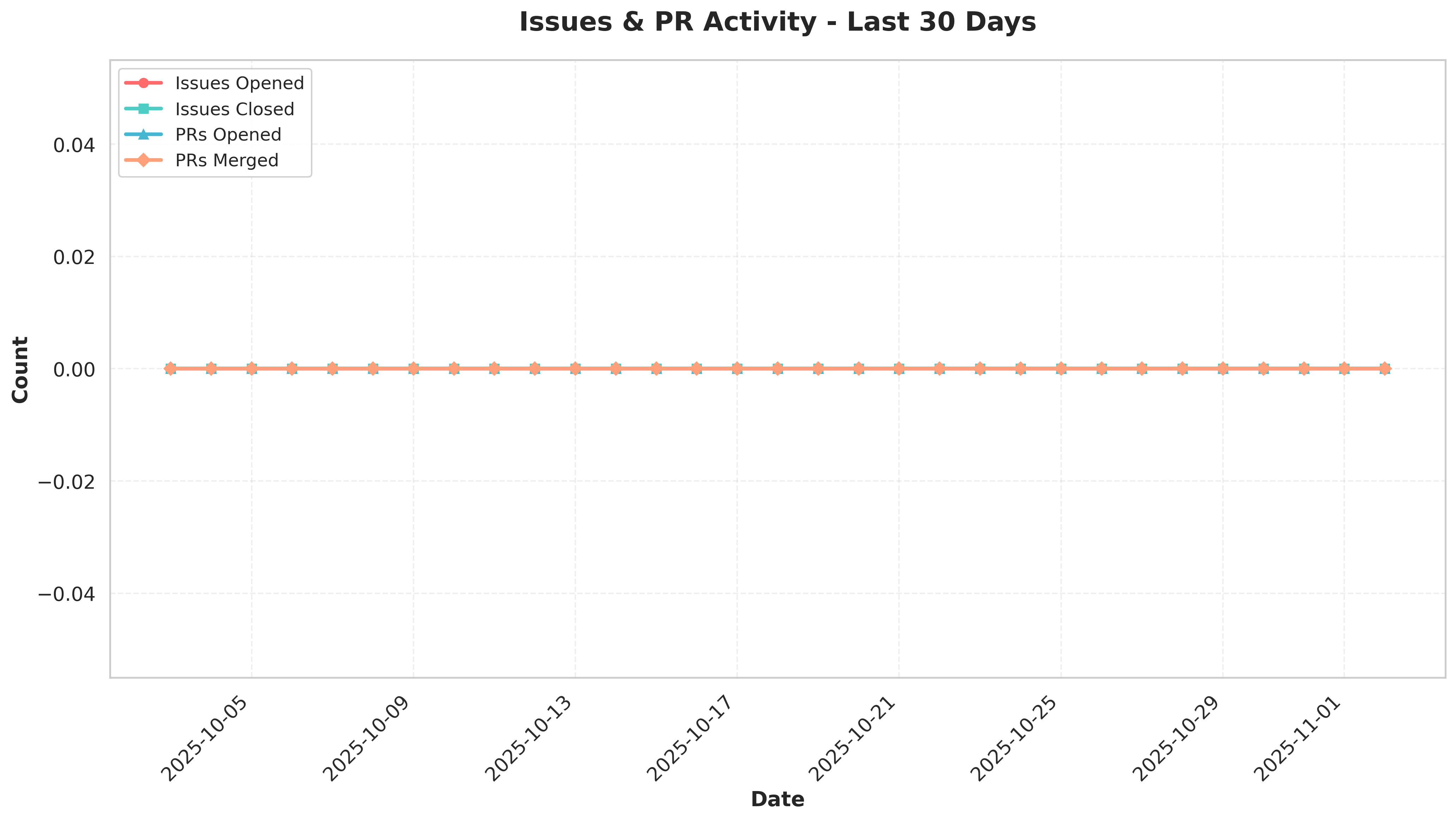 Activity patterns show healthy issue management with issues being opened and closed regularly over the past 30 days. PR activity demonstrates consistent code review cycles, with PRs being merged steadily. The balanced pattern between opened and closed items indicates good workflow health and sustainable pace.