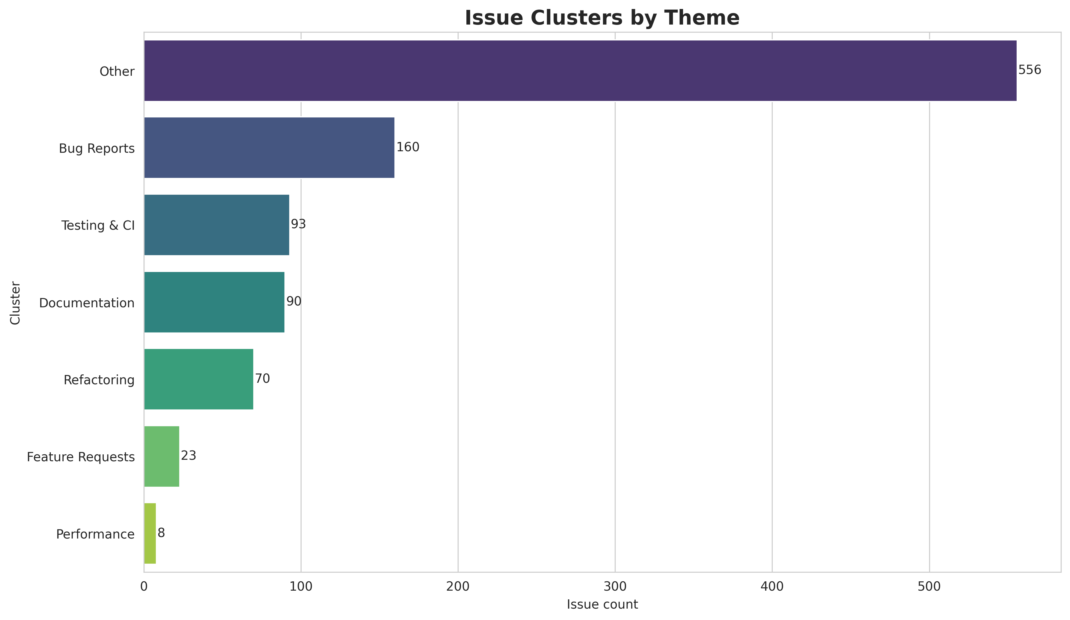 General backlog grooming dominates (556 issues), but Bug Reports (160), Testing & CI (93), Documentation (90), and Refactoring (70) make up the bulk of the actionable work. Feature Requests remain a small slice (23), indicating a stronger maintenance vs. net-new balance.
