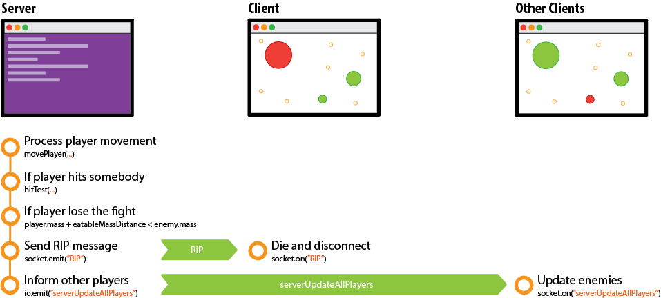 array from server side. Then, it will reply back to all players with two messages serverUpdateAllPlayers and serverUpdateAllFoods.