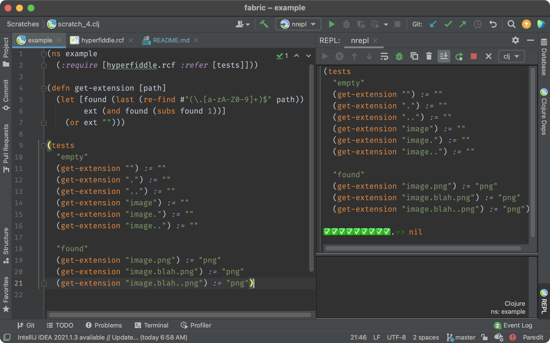 RCF turns your Rich Comment Forms into tests (in the same file as your functions). Send form or file to REPL to run tests and it squirts dopamine ✅✅✅. It's good, try it!