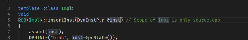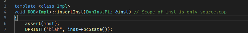 ROB<Impl>::insertInst(DynInstPtr &inst) // Scope of inst is only source.cpp