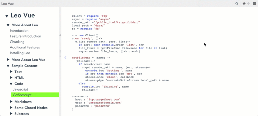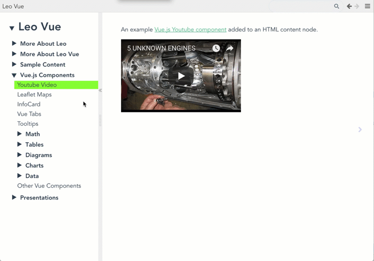 Content in nodes can contain Vue components or csv data. LeoVue renders the Vue components.