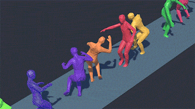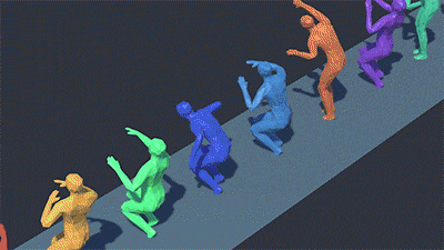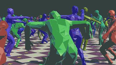 This is my second attempt at generating dance animation with a procedural method (I tried it a few years ago). This is not a complex algorithm, nor involved any AI-ish techniques. These characters are controlled with a few of sin curves and Perlin noise functions. The standard humanoid IK rig is used to animate the model.