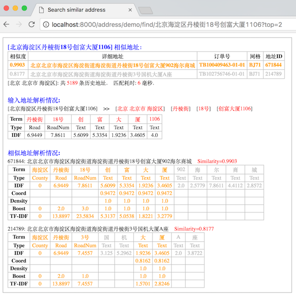 项目中计算两个地址相似度借鉴了文本TF-IDF余弦相似度算法、Lucene的评分算法。