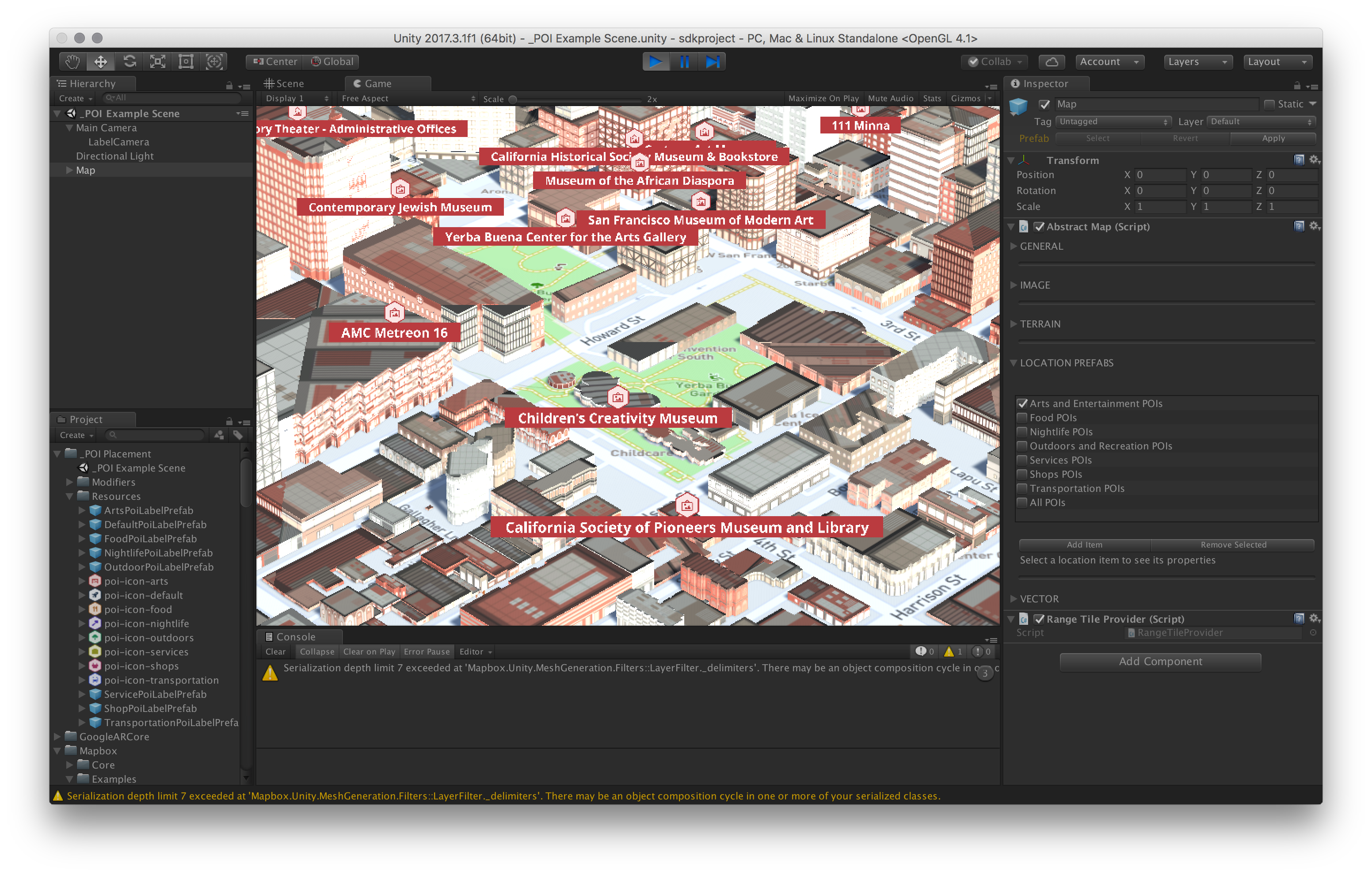 * master merge (#907) * add class to open settings for app on Android * update AutoSyncScene * fix AutoSyncScene and WorldAlignmentKit prefab * increase desired accuracy * increase desired accuracy * hopefully getting there * Prefab block for configuration window * update worldalignmentprefab * Merge explorer and interactive styled map examples. * images updated * layout, changelog link * Update WorldAlignmentKit prefab + fix reload script to use "update" function. * ar example scene names * Updated `Explorer` scene. * Updated worlsAlignmentKit * Updated working AR scene. * Fix double map initialize issue. * remove extra example scenes * fix merge conflict: PropertyDrawers.meta * prefab body text * update TabletopAR image * Possible fix for worldScale AR * Add namespace for ObjectPool + change Awake to start in Position with LocationProvider * WIP manual sync AR scene * fix broken WorldAlignmentKit.prefab after merge * make debug paths thicker * Add missing namespaces. * Missing namespace. * Manual World Alignment scene and prefab * fix broken meta file * Update scenes. * Update version to 1.4.0 * Scene cleanup - delete old examples * Fix wrong unwrapped tile id * Possible fix for Configuration window `NullReference` * remove Android pre-build checks for duplicate libraries (#574) * WorldAlignmentKit prefab: remove layer 'Map' from culling mask of Main Camera * move UniAndroidPermission to PlugIns folder * add sub-assets in scenelists via editor (#586) * Moved editor files to Assets/Mapbox/Unity/Editor * Delete moved files - Atlas Generator & scriptable Palette UI * Added Mapbox.Editor namespace, converted spaces to tabs. * Fix compile errors related to meta files. * Cleanup tooltip text. * Fix Warnings. * Update scenes. * Cleanup warnings - pass 2. * Cleanup warnings pass 3. * Update ScenesList.cs * Fix typecast error on filters + filter Pois labels based on localRank. * Add Update method to RangeTileProvider. * Update PathHelpers.cs * Change explorer to Data Explorer, clean unused assets. * fix duplicate buildings in WorldScaleAR-ManualAlignment * silence remaining warnings * Fix screenshot name for explorer, add initialization to elevationLayerProperties as a defensive fix. * Fix typo * Fix build error, turn vector layer off for Globe example, Add build settings. * Config window 1.4 (#587) * add sub-assets in scenelists via editor * assign default value to MapboxConfiguration's token status * Change camera for city simulator scene. * fix RasterTileExample * fix VoxelMap * Fix finished status not getting fired event for globe example. * silence another warning and remove unused using * make TileErrorHandler work with new AbstractMap * Fixes for RC3 * Renamed TabletopARKit prefab to ARTableTop * Turn off initializeOnStart for LocationBasedGame prefab. * Defensive fix for crash on iOS. * Fix for missing features - Add property in vectorsublayerproperties to clip features at tile boundary. * Change scene & prefab with clip at tile boundary setting. * Fix NRE's on inspectors for scriptable objects in sharedmodules. * Remove new from LocationProvider prefab name in LocationBasedGame prefab * Asset file cleanup * Trigger finished status for tiles that error out. * Fix flat terrain factory editor. * remove inital wait for GPS on DeviceLocationProvider start. Implement 'IsLocationServiceEnabled' property on 'Location' and send one Location event when location services are not enabled or failed to start in time. * Fix issue with prefab modifier where removing the `IFeaturePropertySettable` was not setting transforms for prefabs. * Make Modifiers & map selectable from node editor, change mismatching button style. * add 'IsLocationServiceInitializing' to 'Location.cs'. Expose that info in the LocationBasedGame scene * Add all layers from explorer v130 example (most layers turned off) * Make foldouts static. * Update scenelist. * move misplaced `link.xml` into MapboxAR subfolder * Remove interaction from DataExplorer scene, Added a new scene for interaction. * Turn buildings on in Data Explorer :) * Scale the canvas to fit the screen. * Change zoomSpeed = 0, merge building layers. * Update formatting of playground scenes, enable camera for data explorer. * Tweaks to scenes for performance & formatting. * Finally turn on the camera movement script on DataExplorer * Fix scaling in y for map & unity tile. Add script to keep camera above terrain for zoomable map. * Update buildingswithUniqueIds property. * Add prerequisite info for AR scenes. * work around crashes on iOS with escaped characters in the URL * Fix height data query. * Add missing using UnityEngine. * Update example descriptions * Disable SetCameraHeight script + add method to query height in unity units. * Update zoomable map scene to not have setCameraHeight * Remove replacing text with latlong for geocode response. * Fix formatting * Remove DirectionsQuery * Update project version * Add event system to CitySimulator scene + filter mouse events on search UI. * Format main scene UI. * another fix for URL encoding for iOS * Update changelog * Make filter values case - insensitive. (#632) * Make filter values case - insensitive. * Add checks to remove white spaces & empty entries. * Actually fix the issue :( * Fix tile position issue with vector features. Remove option when features are grouped. (#629) * Change file folder names (#635) * Remove folder with bad name. * Change name of folder to MapboxStyles instead of MapBoxStyles * Fix range height extrusion (#613) * Fix range height extrusion mesh generation. * Add extrusion scale factor to multiply height values when extruding geometry. * Update Changelog. * Add missing tooltips. * Don't clip min height for RangeHeight Extrusion option. * Add warning if max height is less than min height. Also, add error message and swap values in code * Collider Dropdown in Abstract Map for adding colliders on top of extruded geometry (#637) * wip * Geometry options drawer modified * collider options add