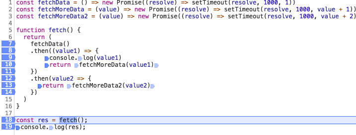console.log(res);因为 then 中的代码是异步执行,所以当你打断点的时候,代码不会顺序执行,尤其当你使用 step over 的时候,then 函数会直接进入下一个 then 函数。