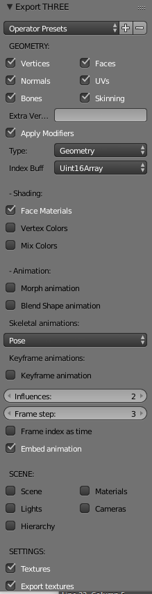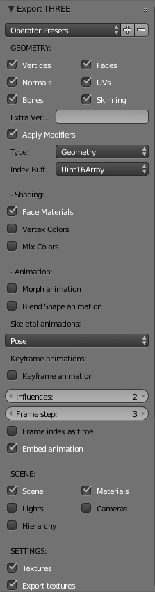 Settings for mesh export (Scene is unchecked, using THREE.JSONLoader