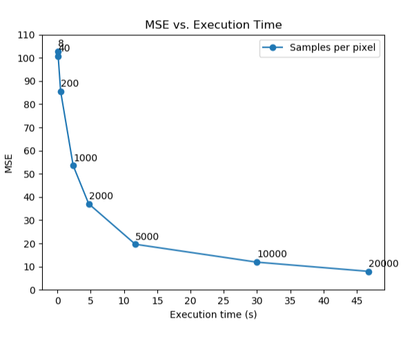 Here we plot the mean squared error vs. the execution time. As we can see, with samples per pixel more than 1000 can the target image achieve a target MSE of 52. 1000 spp is pretty close to the criteria, so let’s say using 1100 samples per pixel is safe enough to pass the threshold with an execution time under 5 seconds.
