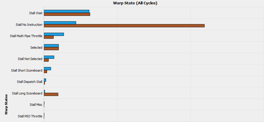 From the above graph, we can see that the warp stall was greatly eliminated, especially warp stall due to no instructions, which indicates a better utilization of warps.