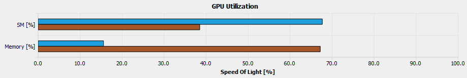 After analyzing the utilization for compute and memory resources of the GPU, we can clearly see that memory is more heavily utilized than Compute. Therefore, a good optimization approach is to improve warp utilization or to reduce memory throughput.